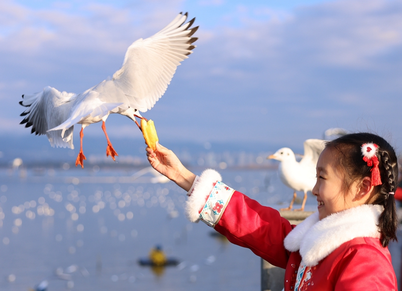 游客在昆明滇池边投喂红嘴鸥(2024年1月17日摄)。